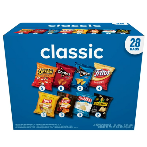 - 28 Count Variety: 3 Lay's Classic Potato Chips, 5 CHEETOS Crunchy, 4 FRITOS Original, 3 Lay’s Barbecue Potato chips, 6 DORITOS Nacho Cheese Tortilla Chips, 2 DORITOS Cool Ranch, 2 Smartfood White Cheddar, and 3 Ruffles Original