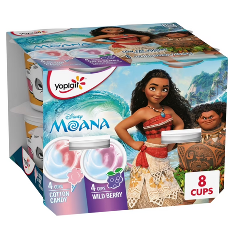 - CONTAINS: One 32 oz Variety Pack of Yoplait Disney Moana Low Fat Kids Yogurt Cups in cotton candy and wild berry flavors; Eight 4 oz yogurt cups